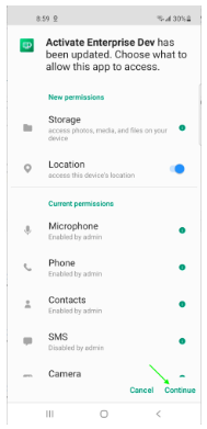 - Enable all permissions by selecting Continue (This step might not appear if the previously described profiles have been applied).