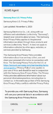 Accept the KNOX KLMS Agent Agreement by selecting NEXT (This step might appear after launching AX). The KLMS Agent (Knox License Agreement) will only show on Android 11.