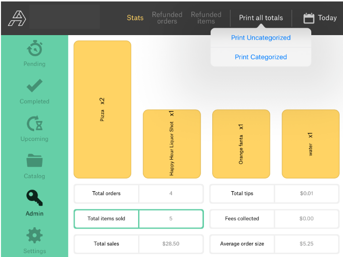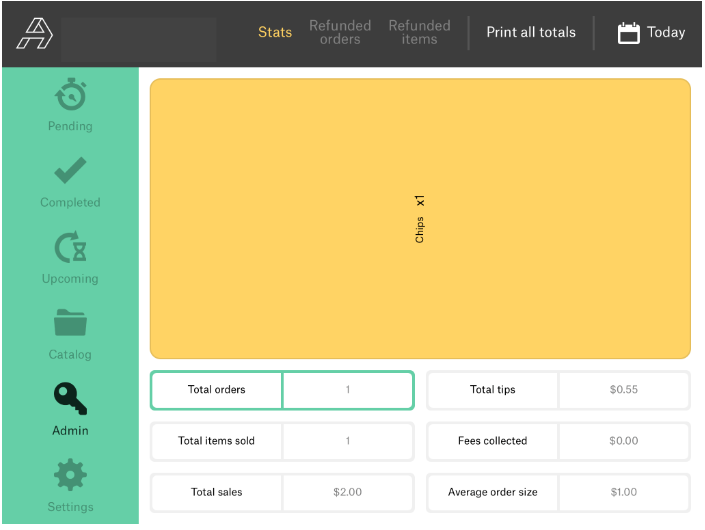 View the current stats, including Total Orders, Total Items Sold, Total Sales, Total Tips, Fees Collected, and Average Order Size for the desired date range. To expand a category, simply tap on it.