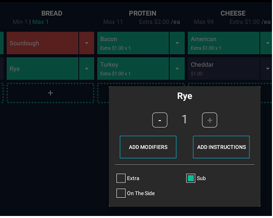 - Clicking on a modifier not currently selected will make it an ADD (green).