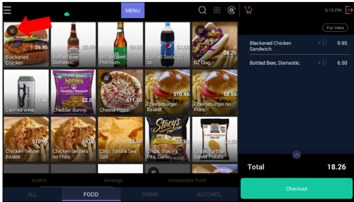 Note: Items that cannot be modified will not have this icon. When you tap on the item tile, it will be added to the Cart.