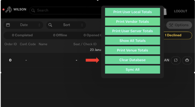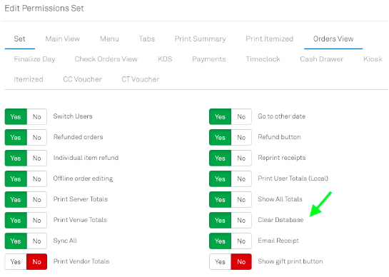 Note: The Clear Database option must be enabled on the 'Orders View' tab of the permissions sets that are assigned to the Shared Login on the terminal.