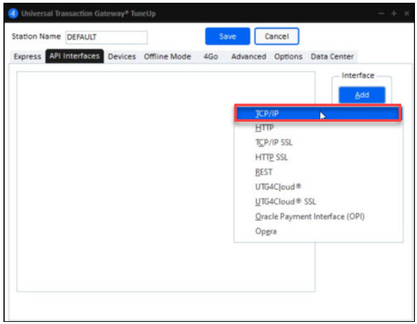 When on the API Interfaces tab, select Add and select TCP/IP just like you would when installing it on a terminal.