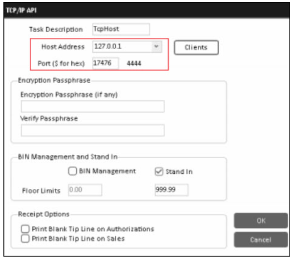 - Host Address: This is typically the loopback IP of 127.0.0.1; however, use your local dealer’s info that you type in for normal Shift4 installs if not using 127.0.0.1