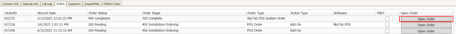 - Select the Orders tab, and select the order containing an access point device by selecting Open Order.