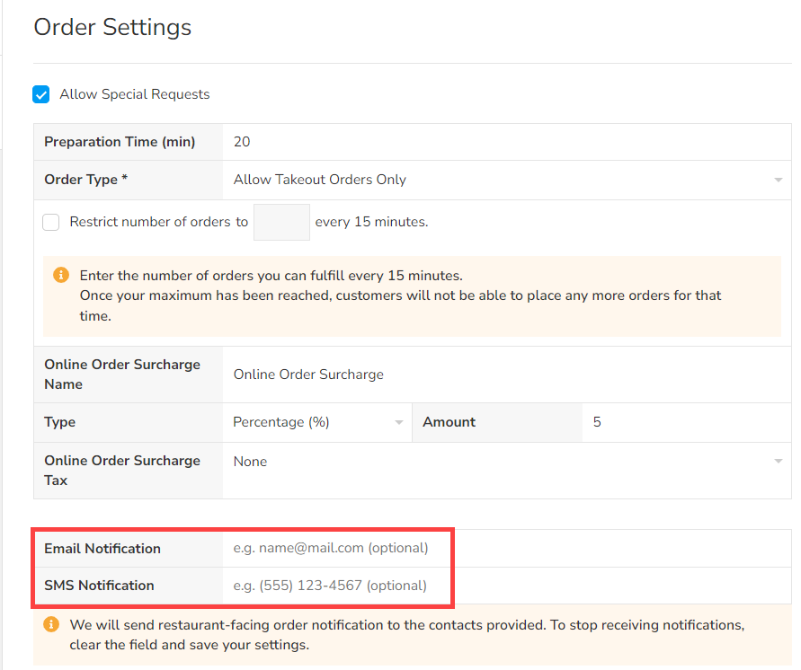 - Scroll down to the Order Settings section and type in your information for Email Notication and/or SMS Notification. This sends the notification to the email or phone number entered.