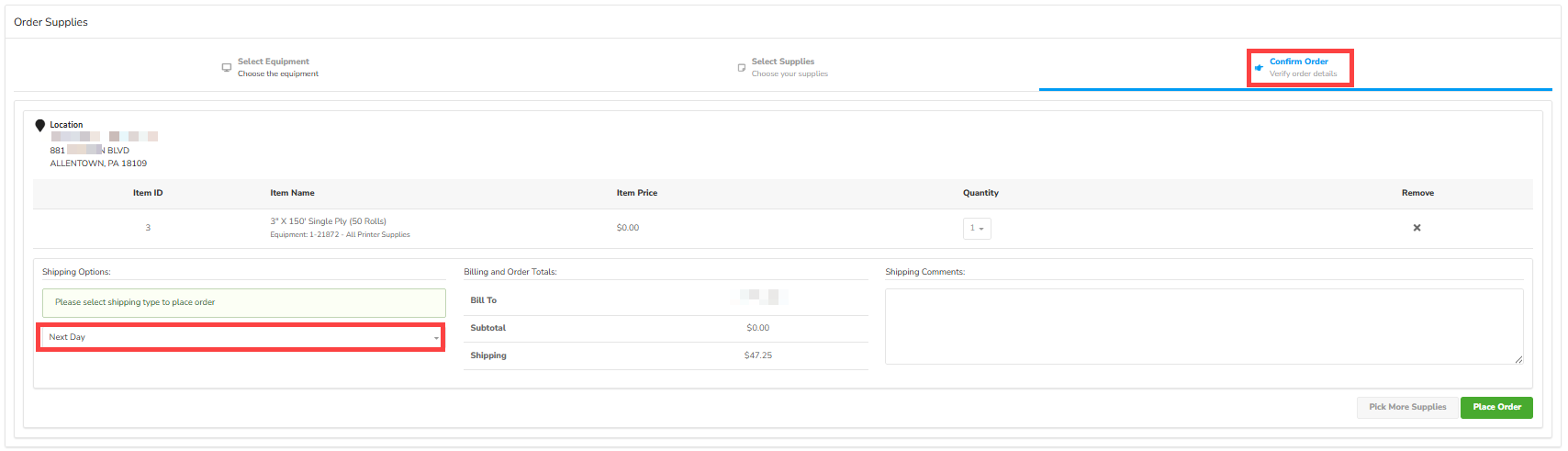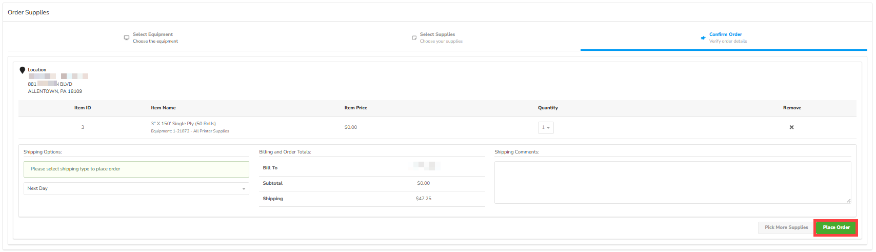 - Select Place Order or Pick More Supplies.