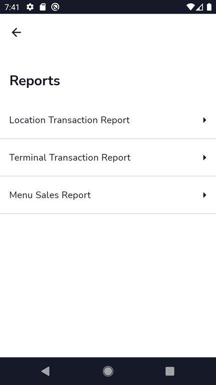 - You have three report options: the Location Transaction, Terminal Transaction, or the Menu Sales Report. Select the report to view it.