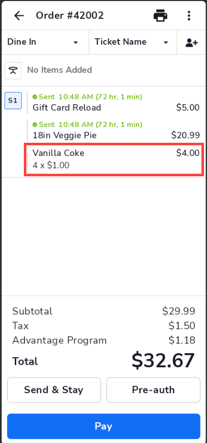 The ticket will display the item with the selected quantity (for example, Coke – 4 × $5.00).