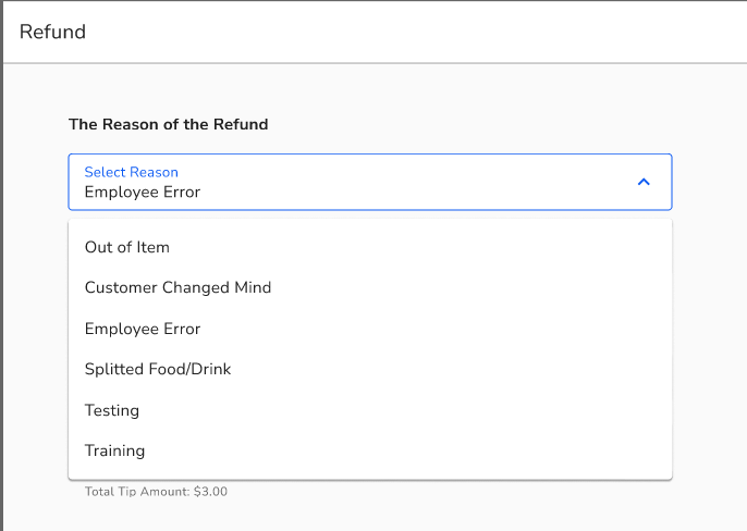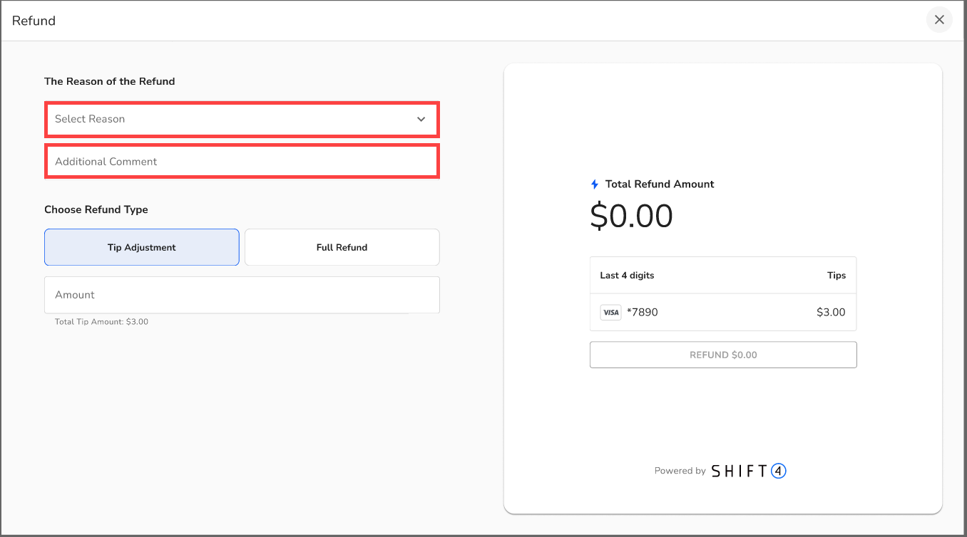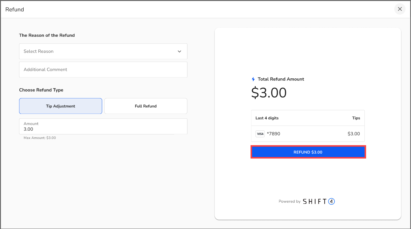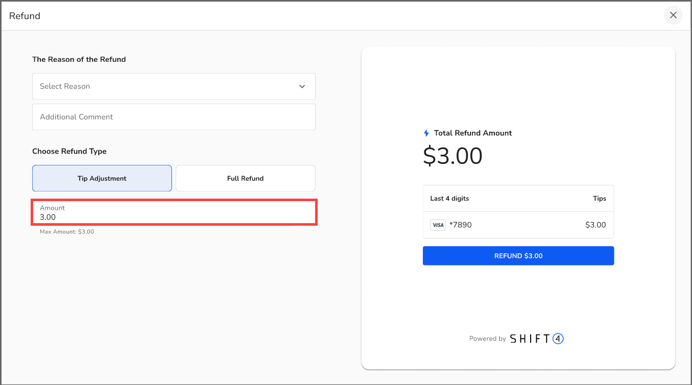 - Input the refund amount (must be less than or equal to the original tip amount).