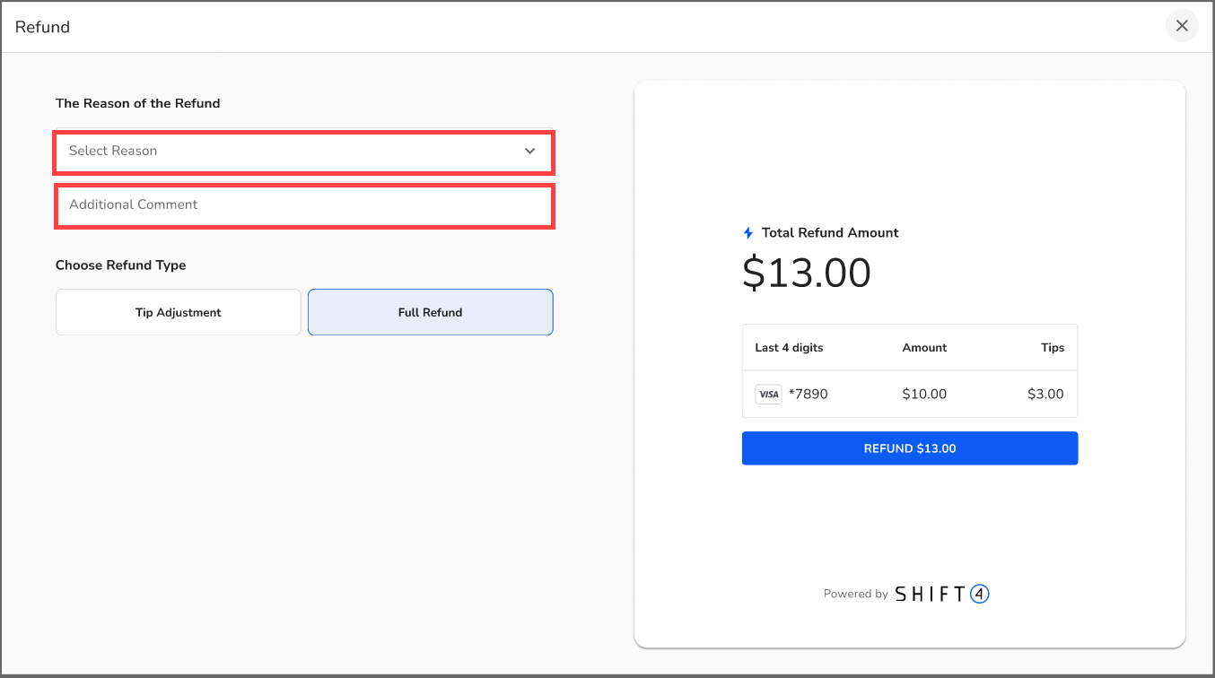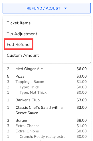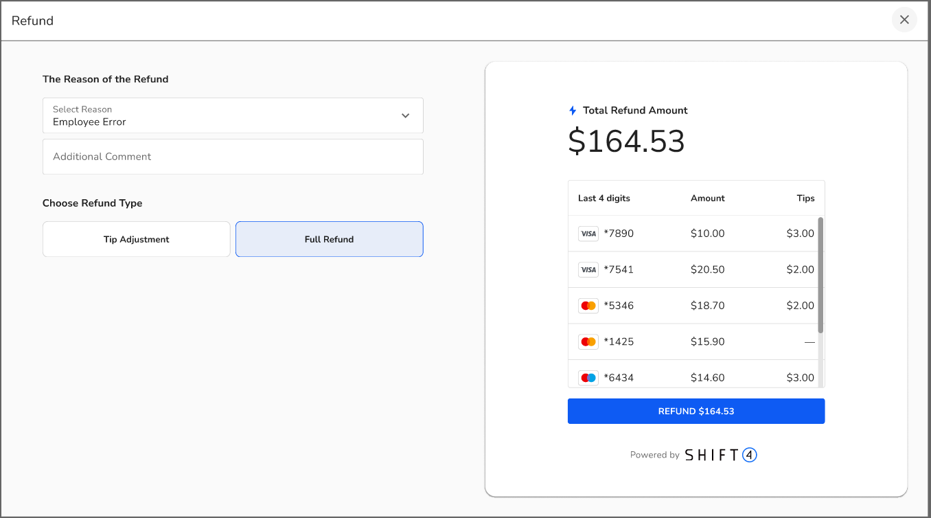 The original Transaction and Ticket Tip amount determines the maximum refund amount. Additionally, each payment type will receive a refund for the original payment amount per payment type.