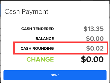 The Cash Rounding amount is displayed on the Cash Payment window.