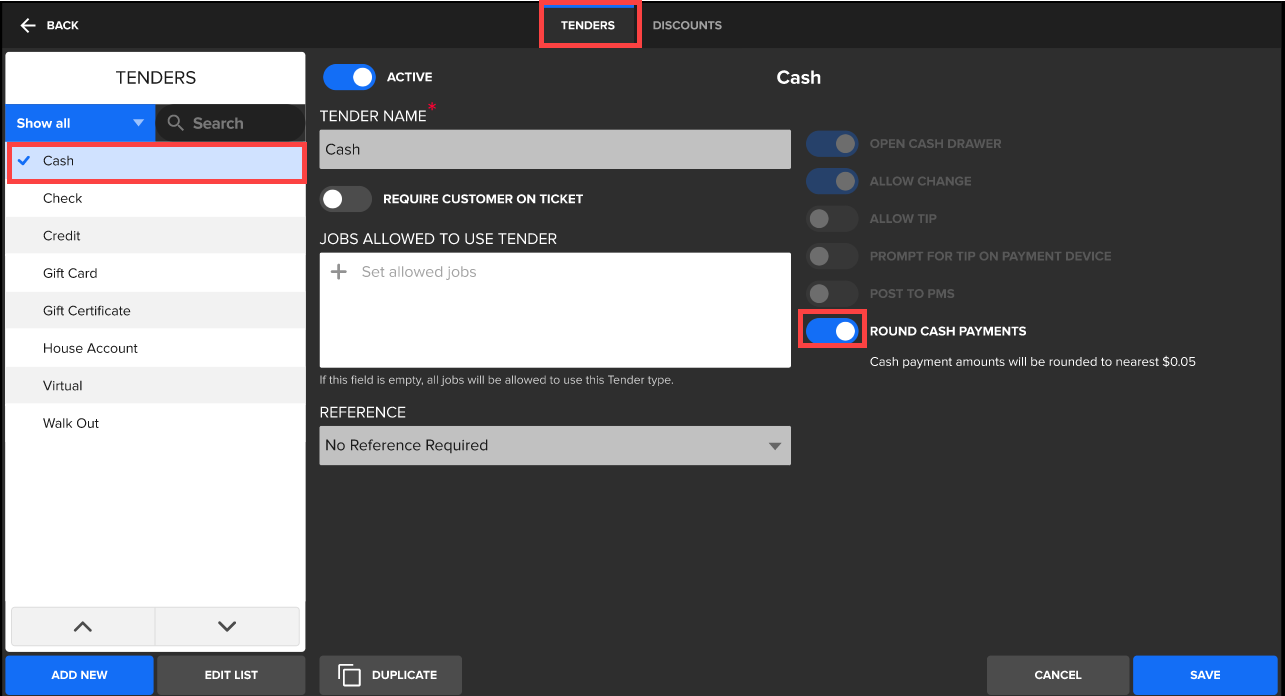 - Slide the toggle to enable "Round Cash Payments." Cash payment amounts will be rounded to the nearest $0.05.