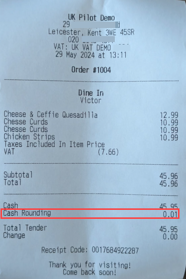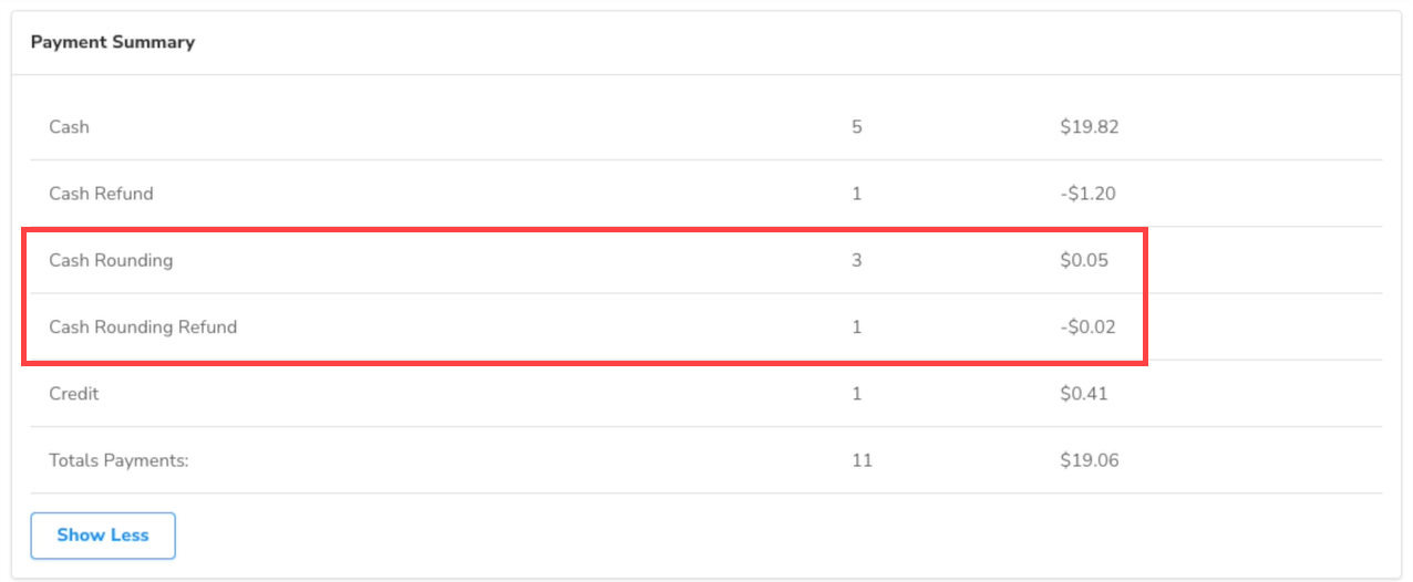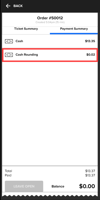 The payment summary displays the Cash Rounding amount, which can be a positive or negative value.
