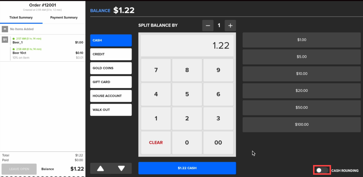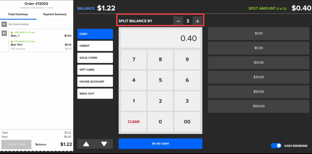 When Cash Rounding is enabled, and you split the bill and then attempt to pay a part of it with cash, the system automatically suggests a rounded amount. However, the system will not suggest a rounded amount if you use a different payment method, such as credit. You can also disable cash rounding here by using the toggle if you prefer.