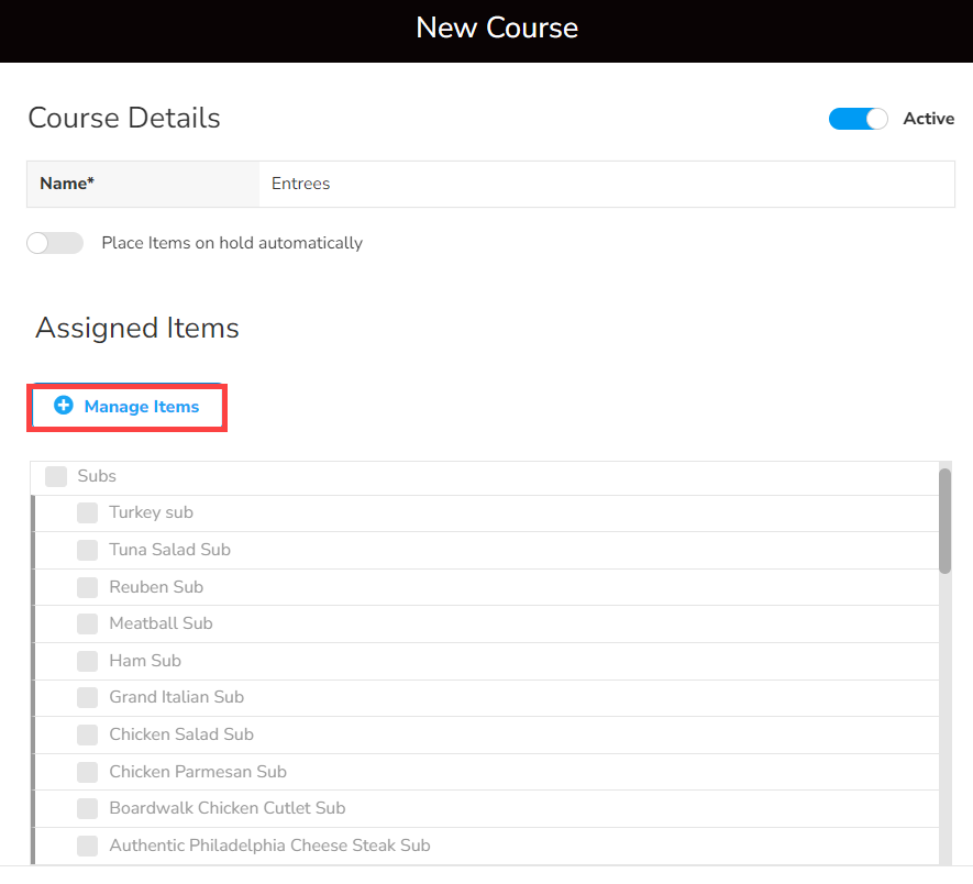 - On the New Course screen, enter the Course Name and select Manage Items to assign items to the course.