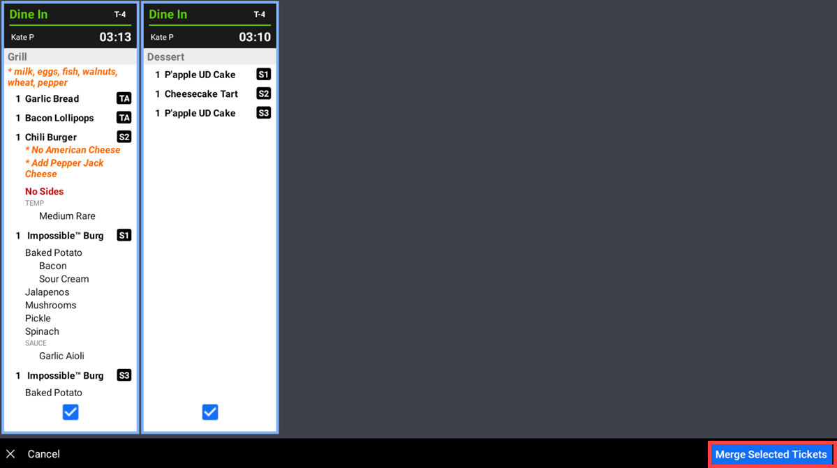 Tickets may only be merged if they are from the same order. This usually occurs when a ticket has been sent to the kitchen, and then more items are added (usually under a new seat), and the ticket is sent with the new items. Learn how to merge tickets below.
