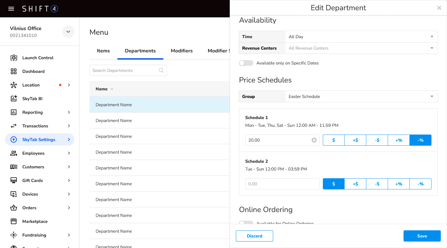 In Lighthouse Business Manager (LBM), navigate to SkyTab Settings > Menu > Dynamic Pricing (formerly Scheduled Pricing) to configure Dynamic Pricing.