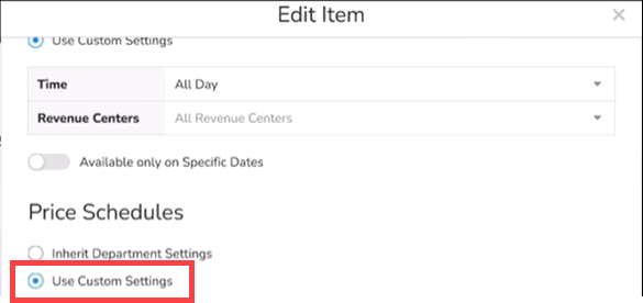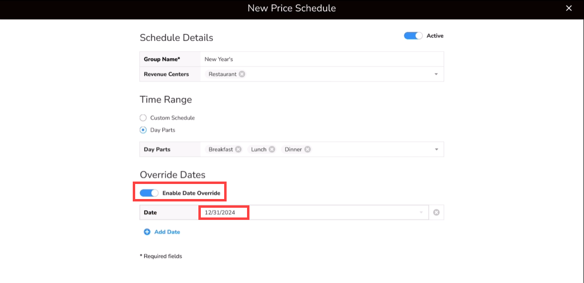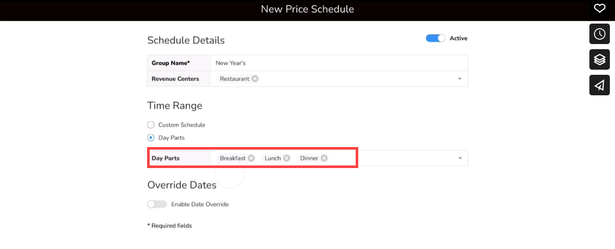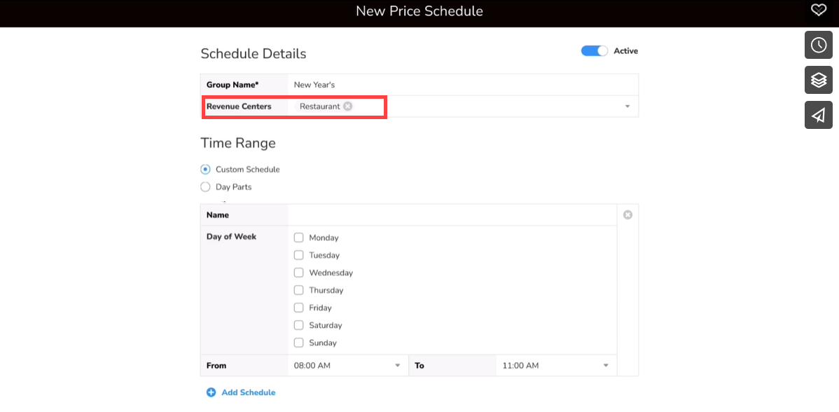 - Enable multiple active schedules by assigning non-overlapping Revenue Centers to different Price Schedules.
