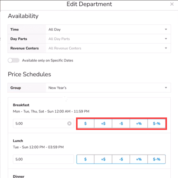 You can now custom price more of your menu at overlapping times based on Revenue Centers. The overhaul of Scheduled Pricing allows the assignment of Revenue Centers to multiple active price groups and enables scheduling by Day Part as well as custom Override Dates. Pricing rules can be applied to Departments and inherited or overridden by individual Items. Additionally, a new pricing rule will be introduced for flat dollar increases or decreases amounts.