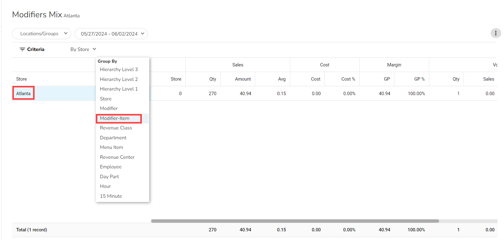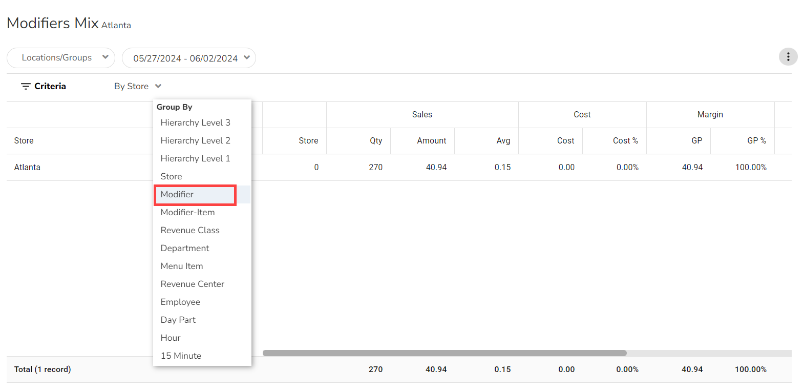 To view the Modifiers by menu item, select Group By > Modifier-Item from the dropdown list.