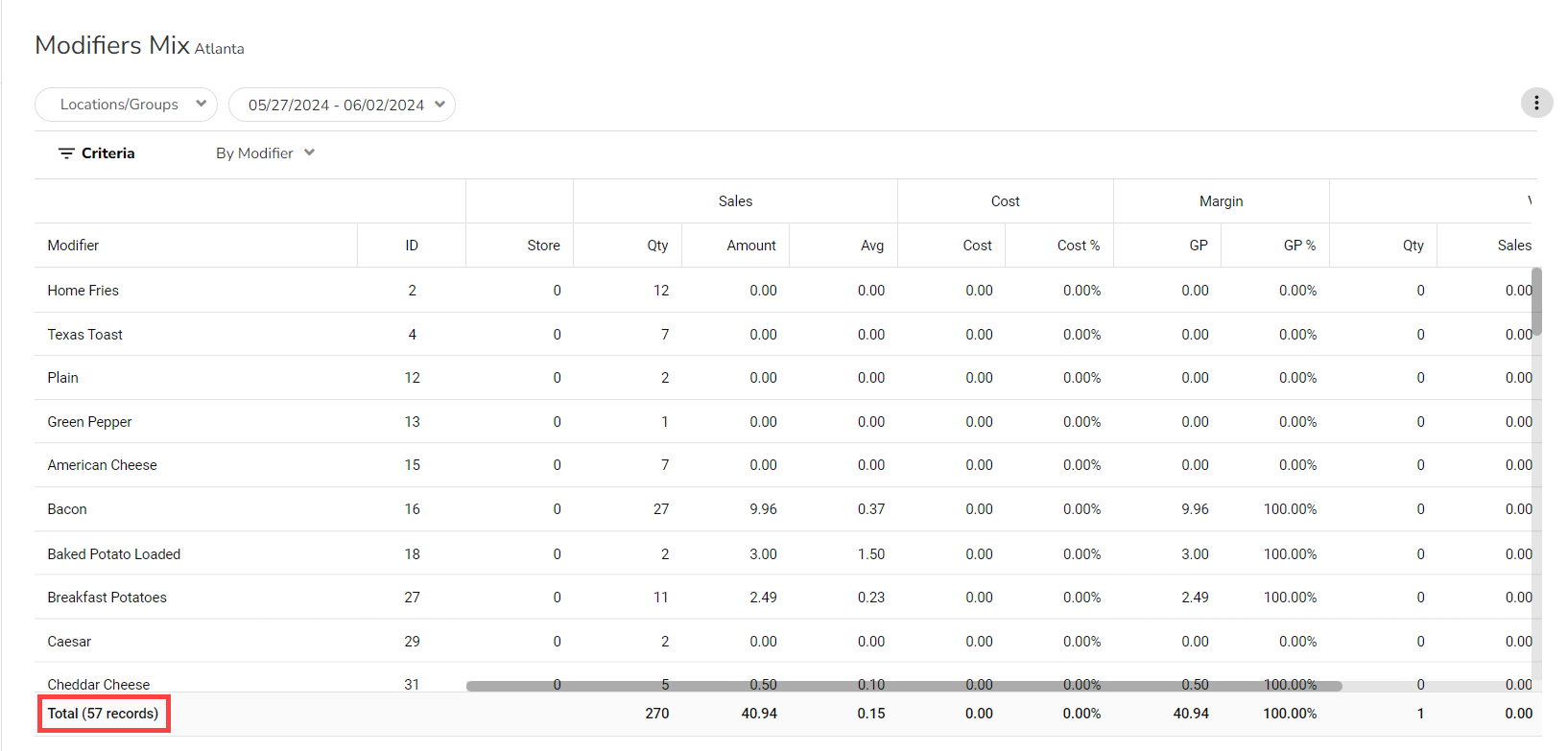 The report displays a list of all of the Modifiers used during the date range. In the report below, you can see 57 different Modifiers were used.