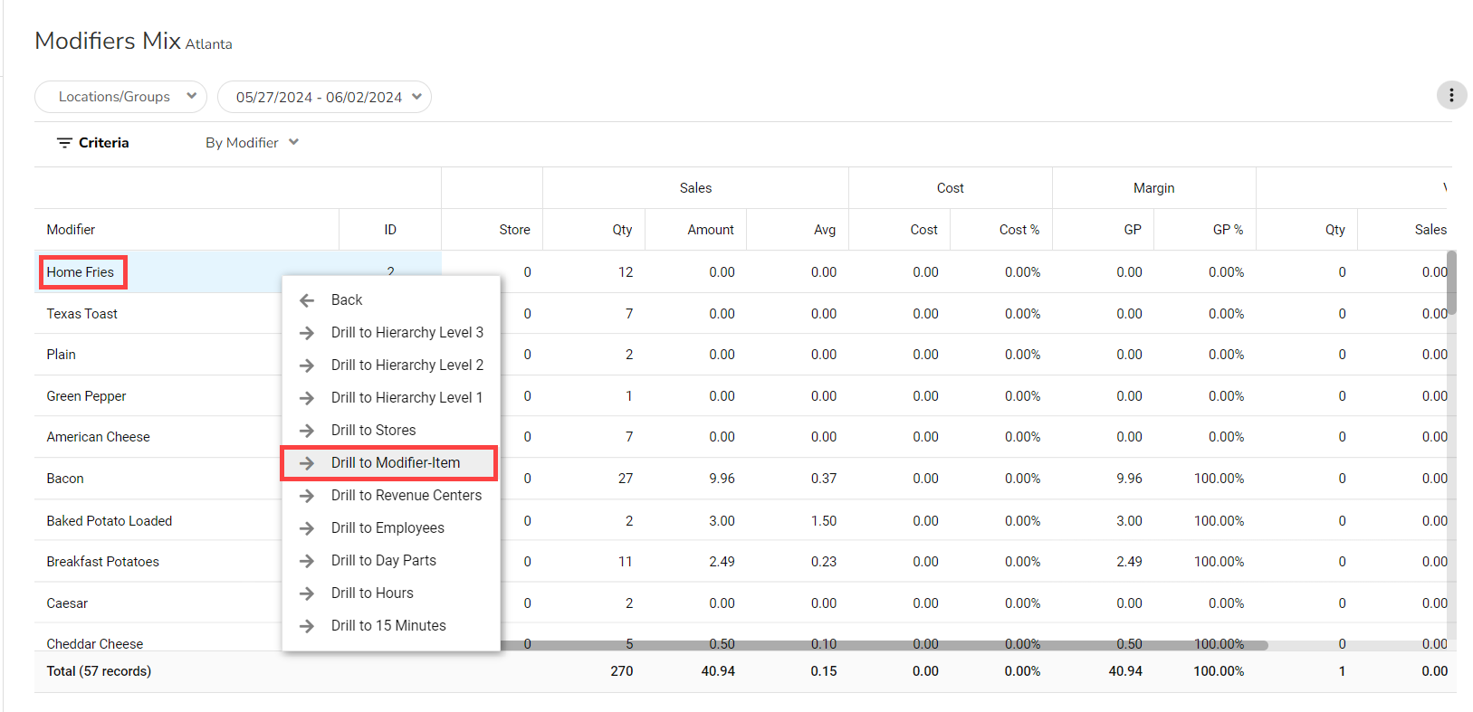 If we “Drill To” on any of the modifier lines, we can see the Modifier-Item. When we “Drill To” Home Fries and select Modifier-Item, we can see all the menu items using Home Fries as a Modifier.