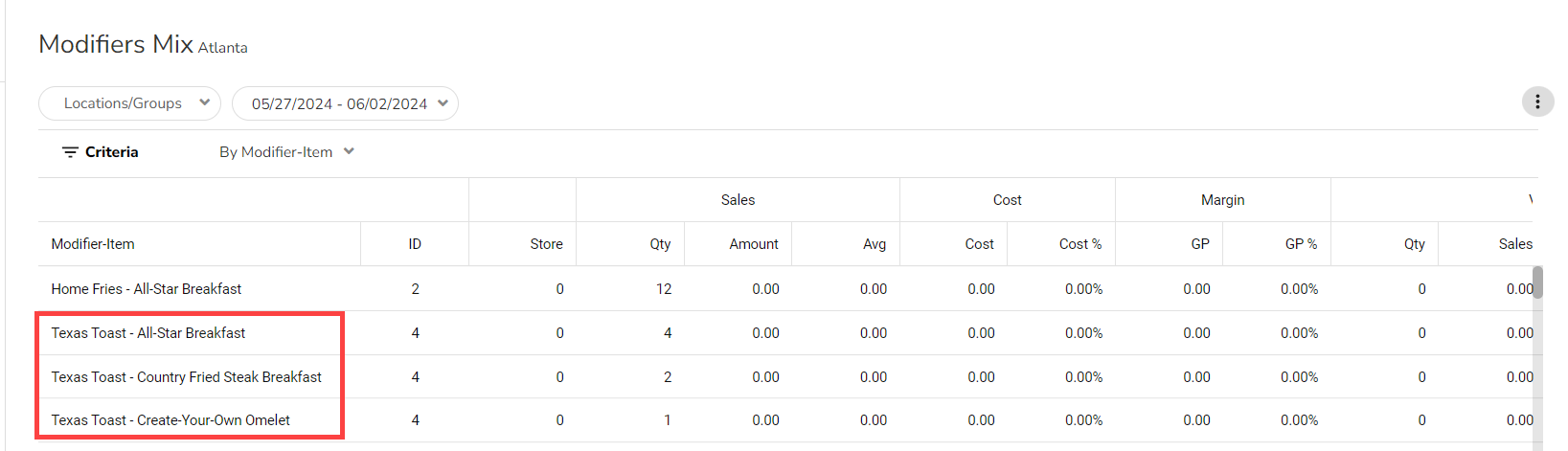 In the report below, we can see there were three menu items that used Texas Toast.