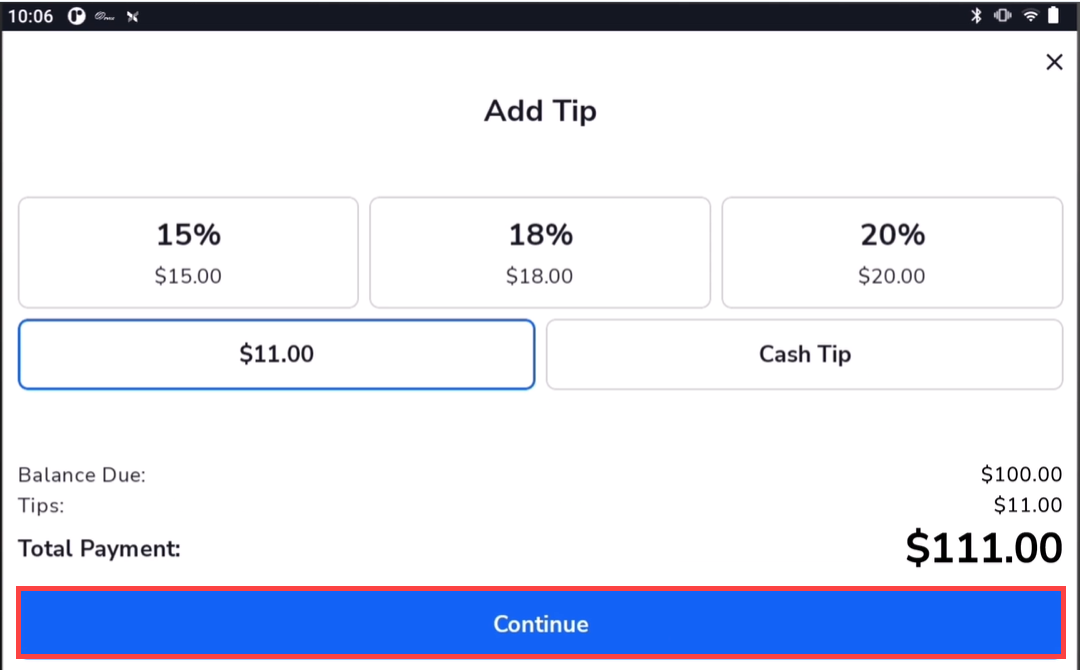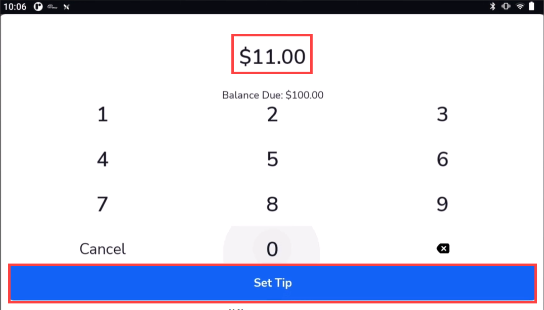 - We entered 11.00 for the tip. Tap Set Tip.