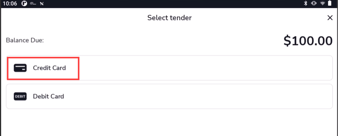 - Tap the Credit Card option in the "Select tender" screen.