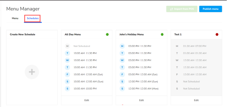 Menu headings are pulled from the Schedule names created in Menu Manager in Lighthouse Business Manager (LBM). Below, you can see we have two schedules: John's Holiday Menu and All Day Menu.