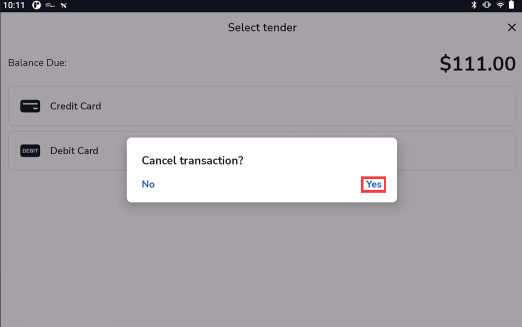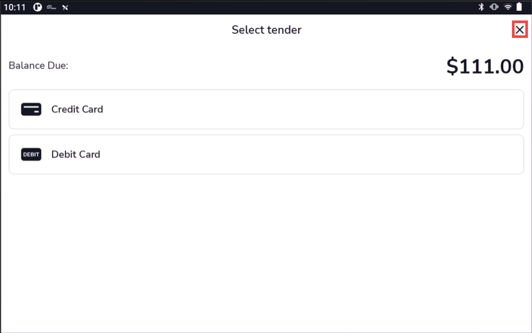 - From the "Select tender" screen, tap the 'X' in the upper right corner.