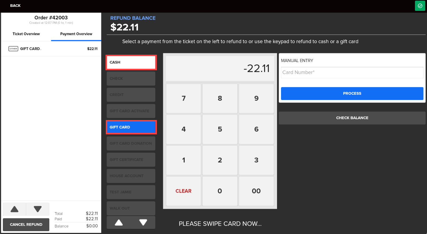 When performing a Refund for a Gift Card, you will locate the ticket above and select the "Refund" option. We recommend refunding it in Cash, but if the customer is adamant about reloading the Gift Card of that value, you will need the card number.