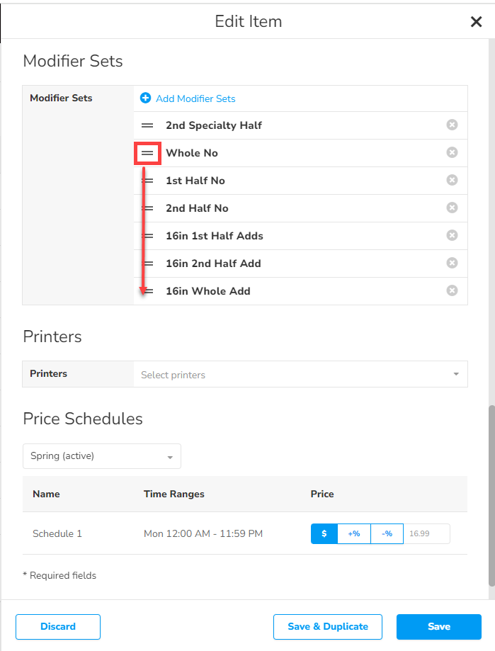 - From the Items tab, choose the specific item you wish to modify the order of its modifier set.