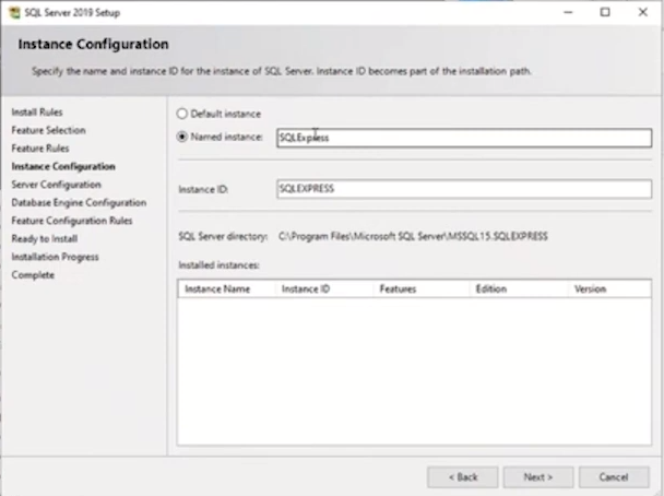 - Next, it will ask us to choose our SQLExpress name, the default SQLEXPRESS will be fine as long as there are not multiple SQL Instances on the device. Press Next.