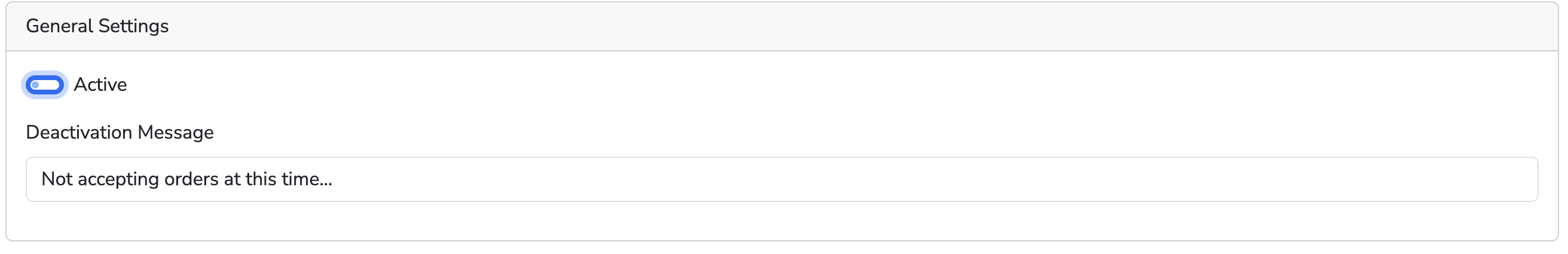 - Slide the Active toggle under General Settings to turn it off. This will deactivate the Kiosk, preventing new orders from being placed. You can also add a message to display for users to let them know you aren't currently accepting orders.