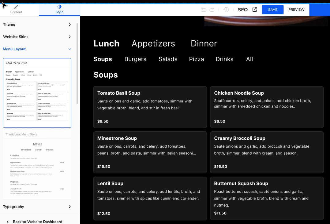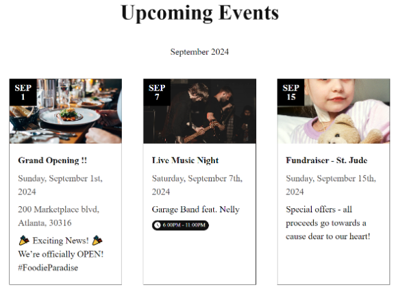 Calendar Events: Provides the capability to add calendar events to the website. This new feature highlights upcoming events like live music, special dinners, and cooking classes, making your site more engaging and informative. Guests can easily plan their visits, enhancing their dining experience and encouraging repeat visits.