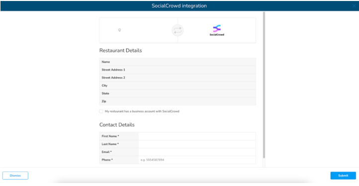 - If you already have a SocialCrowd account, check the box for "My restaurant has a business account with SocialCrowd." This will prompt the SocialCrowd team to find your existing account and activate your Marketplace application.