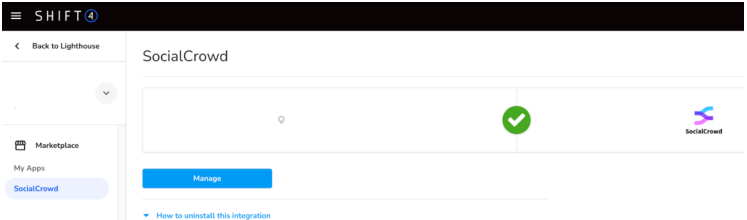 - Once SocialCrowd has linked your account, you will see a green checkmark indicating a successful installation. The clock symbol in the left navigation sidebar will also have been removed. You will also now have the ability to manage your account or uninstall the application at any time.