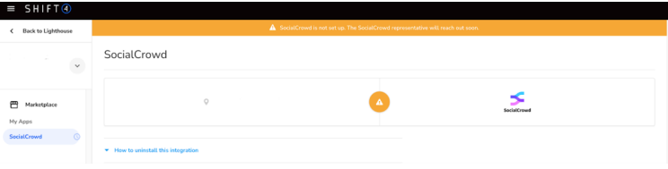 Note: You will now notice the application page shows a yield sign in an orange circle and a clock symbol next to SocialCrowd on the left navigation sidebar. This indicates the installation is still pending. - At this point, you will be contacted by SocialCrowd to go through an onboarding process before the accounts are linked.