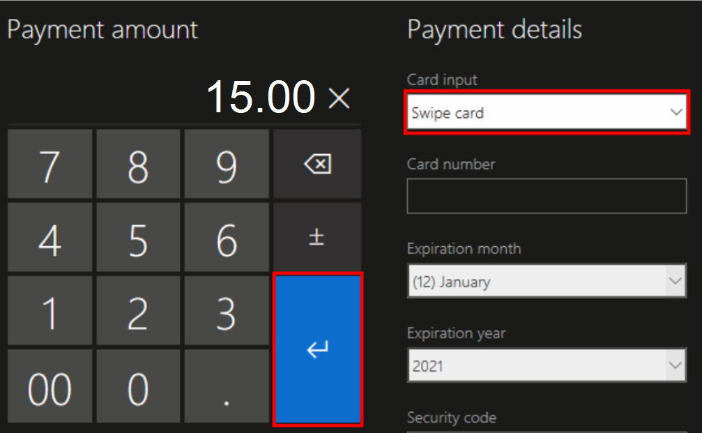 - From the Card Input drop down, select Swipe card, then press Enter.