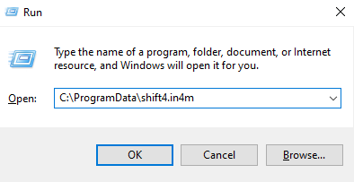 - Type C:\ProgramData\shift4.in4m and press Enter to directly open the file if it exists.