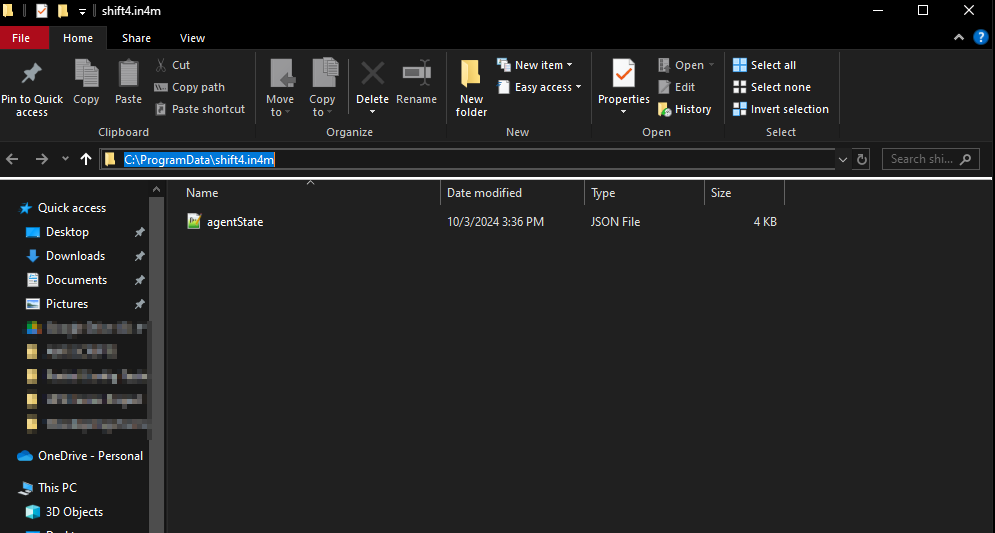 - Navigate to C:\ProgramData\shift4.in4m and find the agentState.json file.