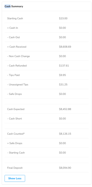 The Financial Overview and Activity Summary will summarize Tips in the cash summary that were not assigned to a real user (the unassigned user) as part of the reduction in total cash.