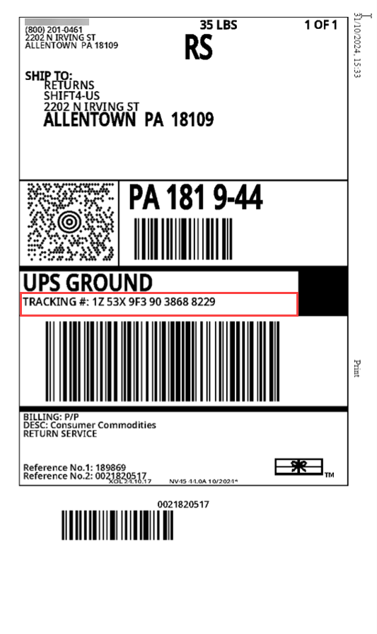 The tracking number of returned equipment can be located on the return labels that were sent to the Business email address, as shown in the image below: