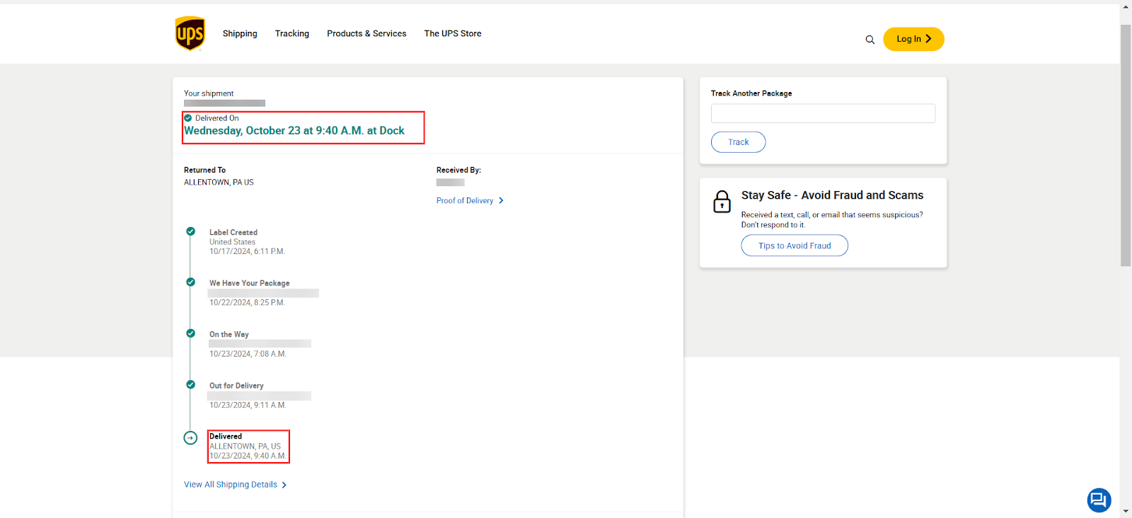 If it displays Delivered on: [Date/Time] as shown in the image below, it is confirmed that the equipment has been returned.