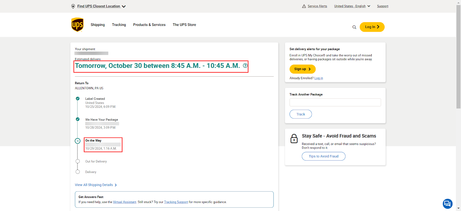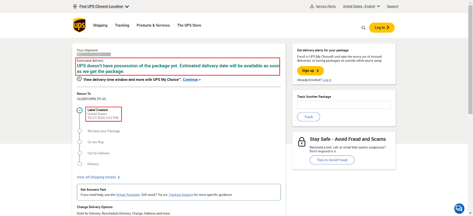 If it displays UPS doesn’t have possession of the package yet. Estimated delivery date will be available as soon as we get the package, the equipment has NOT been returned yet.