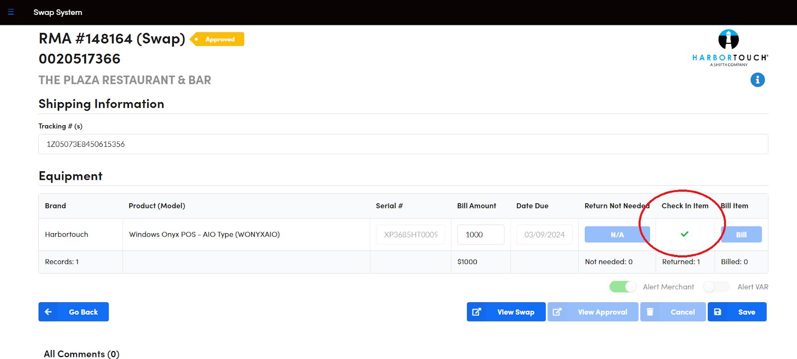 The agent will look up the status through normal system inquiry methods. The agent does not provide the Shift4 tracking number, but checks the tracking number seen in the RMA of the swap system and provides the caller with confirmation on whether Shift4 shows the item received. If tracking shows receipt by Shift4, but it has not been checked in, the agent will select the RMA Check In button in the swap system, as seen in the image below. The agent will note this in the ticket and continue supporting the merchant.