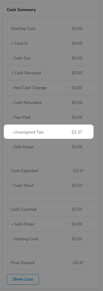 - This line will display the total amount of tips not assigned to any specific employee, allowing you to track the amount that should be removed from the drawer and distributed to employees.