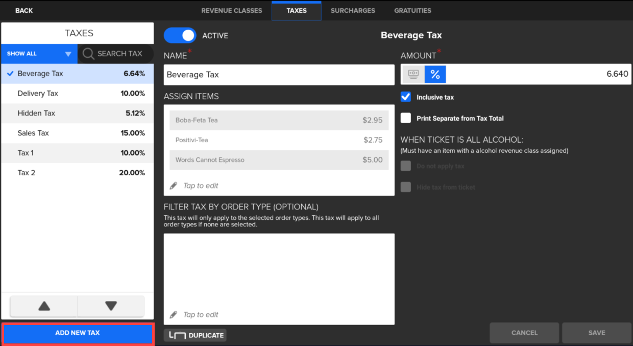 - To create a new tax, tap Add New Tax in the lower-left corner of the screen, fill out the fields, then tap Save.